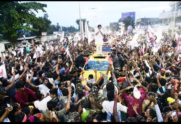 ఇంఛార్జ్ బొలిశెట్టి శ్రీనివాస్ ఆధ్యర్యంలో పార్టీ శ్రేణులు  పవన్ కళ్యాణ్ గారిని పూల వర్షంలో ముంచెత్తాయి. బాణసంచా పేలుళ్లు, జనసేన శ్రేణుల జయజయధ్వానాల మధ్య భారీ రోడ్ షో నిర్వహించారు. పవన్ కళ్యాణ్ గారి సామాజిక మాధ్యమ నినాదం ఎలుగెత్తు.. ఎదురించు.. ఎన్నుకో నినాదంతో పార్టీ శ్రేణులు పెద్ద ఎత్తున స్వాగత బ్యానర్లు ఏర్పాటు చేశారు.