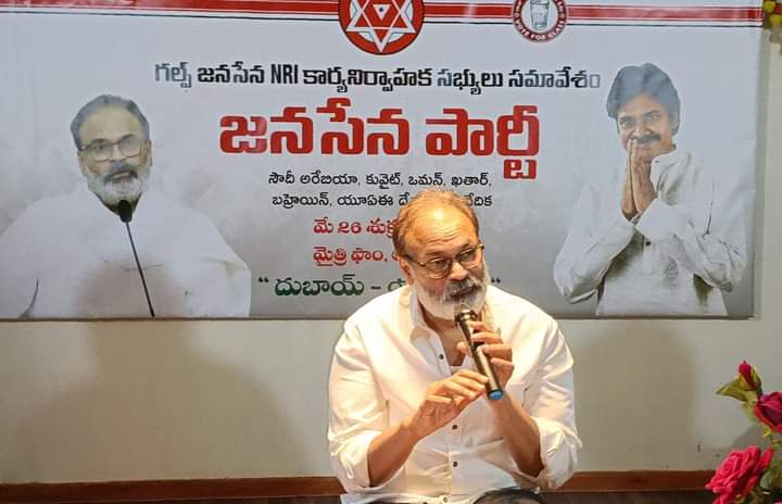 ఆయన దుబాయ్ పర్యటనలో భాగంగా శుక్రవారం అజ్మన్ నగరంలోని మైత్రి ఫామ్ లో గల్ఫ్ దేశాల ఎన్నారై కార్యవర్గ సభ్యుల సమావేశాన్ని నిర్వహించి వారితో మాట్లాడారు. ఆ సమావేశాన్ని ఉద్దేశించి నాగబాబు మాట్లాడుతూ.. వృత్తి, వ్యాపారం పరంగా గల్ఫ్ దేశాల్లో స్థిరపడినప్పటికీ మాతృభూమిపై వీరికి ఉన్న మక్కువతో, అలాగే ప్రజా ప్రయోజనాల కోసం జనసేన పార్టీని